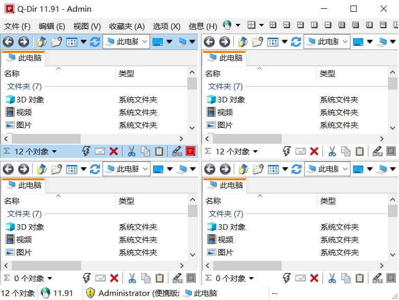 Q-Dir是一款免费的多窗口资源管理器,旨在提高用户在文件操作中的效率。它以其独特的四窗口视图技术(Quadro-View technique)为用户提供了一个强大的替代Windows文件管理器的选择。Q-Dir允许用户同时打开四个独立的浏览窗口,这使得在多个目录间进行文件复制、粘贴或拖拽变得异常便捷。软件支持快速访问常用文件夹、拖放操作、剪贴板功能,以及对不同文件夹类型的管理,如ZIP、FTP、文件柜、网络和系统文件夹等。